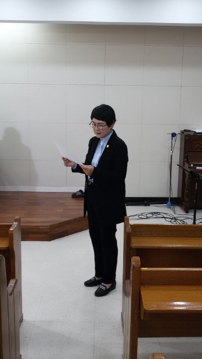 11시에 서문교회 5층 예배실에서 있었다. 서기 김경수목사의 사회로 진행된 이 예배는 시온교회 이혜자 목사 기도후에 성경(딤후